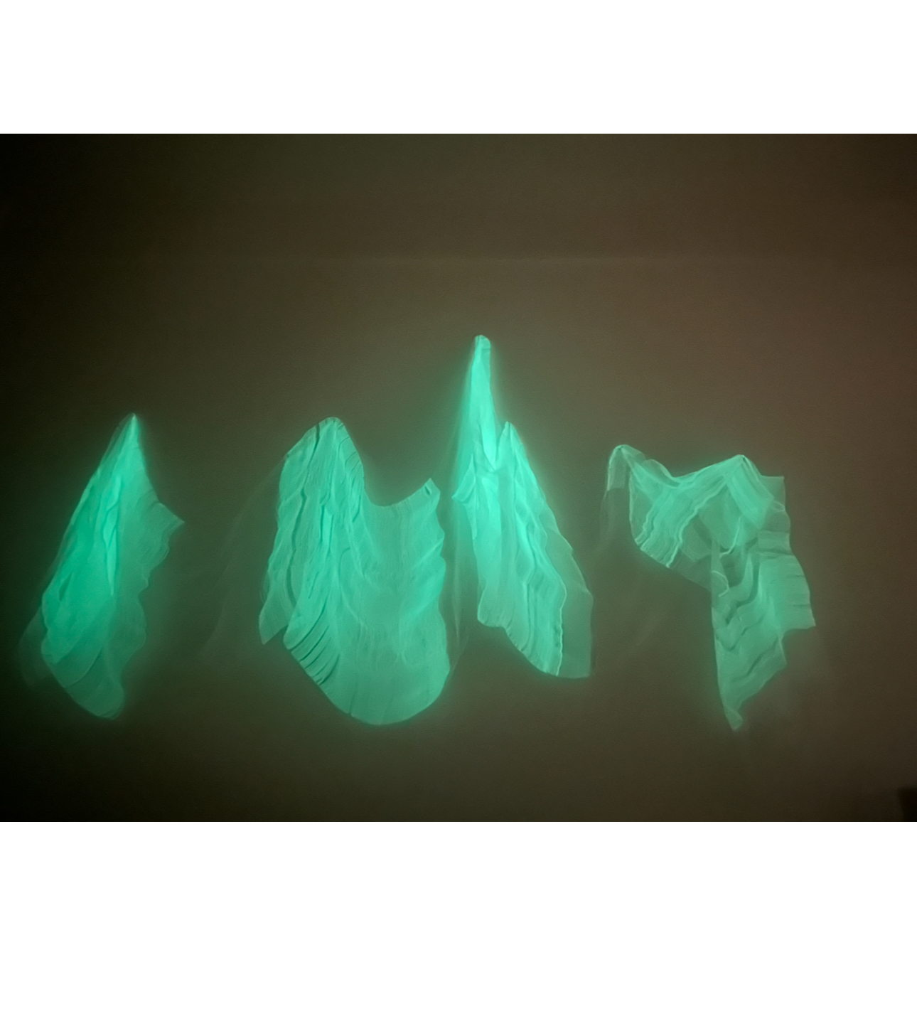 The fine luminous thread white in day light, an ethereal material, visible in the absence of light, evokes the unseen that connects life with afterlife, form, and spirit.